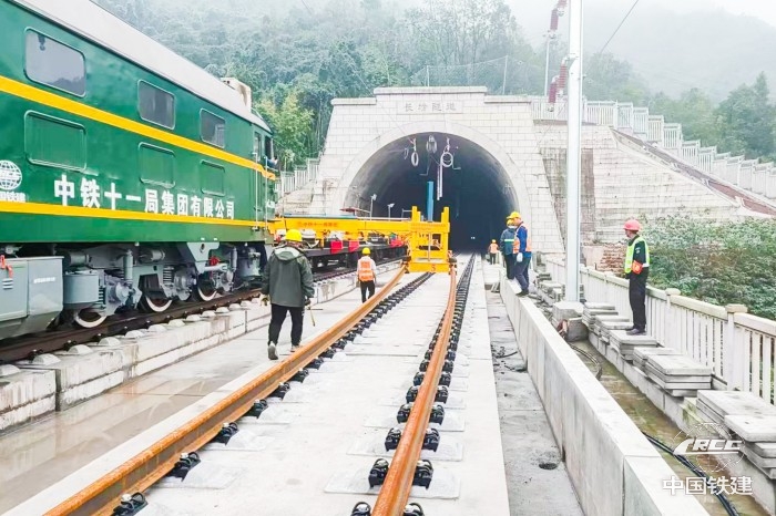在鋪軌施工階段,項目采用由中鐵十一局自主研發的BLCP500型本鄰兩線長鋼軌鋪設機組、智能調度指揮系統等先進設備,不斷強化工程線施工組織能力和安全管控水平。憑借智能化、自動化設備對鋪軌工效的提升,以及建設團隊的高效運轉、緊密協作,項目成功創造了18小時鋪設17.5公里長鋼軌的紀錄,樹立了高效施工的行業新標桿。