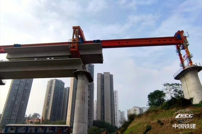 “箱梁到位才是新困難的開始。”張家梁表示,在曲線半徑1400米的情況下架設特殊的異形箱梁,架橋機必須“特別定制”,項目經過多次技術論證,聯合組織設備廠家、設計單位開展技術攻關,最終選用JQXD900t型架橋機,該設備可在曲線半徑1200米的彎道中架梁,配合鋼支墩對支座墊石進行幫寬,順利解決了架橋機運行中的平衡問題,最終歷時14天完成了全部異形箱梁架設任務。