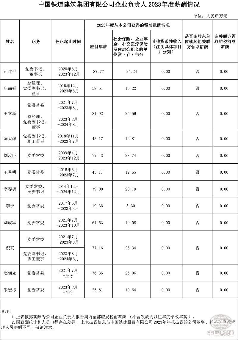 中國鐵道建筑集團(tuán)有限公司企業(yè)負(fù)責(zé)人2023年度薪酬情況