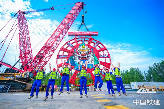 建設者慶祝盾構機刀盤順利下井(趙榮發 攝)