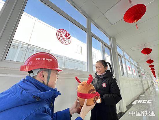 圖2:綜合辦公室部員李晗為探親家屬送上中國鐵建的吉祥物。(宗悅?攝)