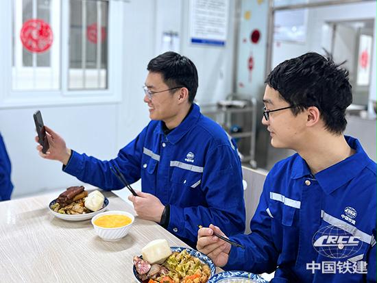 圖8:小年這天,為保障盾構(gòu)機(jī)平穩(wěn)掘進(jìn),盾構(gòu)機(jī)長黃魯依然堅守在一線,在食堂吃飯時和家人視頻,并熱情介紹了自己的同事。(宗悅?攝)