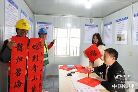 “曾書記,幫我寫一個大‘?!?,我要貼在宿舍門上?!眮碜再F州的鋼筋工安祥君說。為了配合樁基施工,他和貴州的工友們堅守崗位,每天要制作20個鋼筋籠,確保項目施工進度。本次活動送出福字、春聯40多幅,為堅守崗位的建設者們營造出歡樂祥和的新春氛圍。